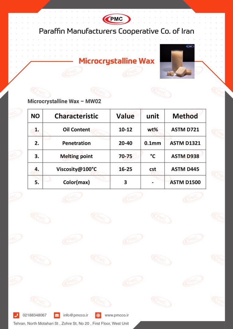 میکروکریستالین وکس مخلوطی از هیدروکربن های اشباع، جامد و شاخه دار می باشد که از تصفیه نفت به دست می آید. میکروکریستالین وکس به صورت بی رنگ و یا زرد رنگ ، بدون بو و دارای نقطه ذوب بین ۶۲ تا ۱۰۲ درجه سانتی گراد می باشد.