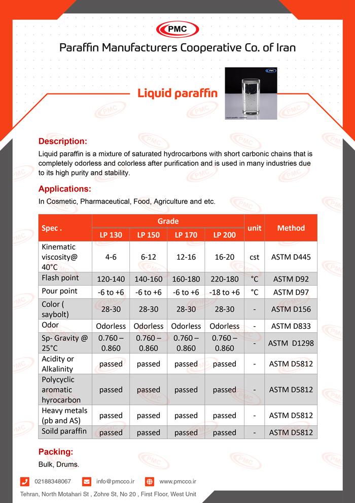 پارافین مایع مخلوطی از هیدروکربن های اشباع شده حلقوی و زنجیره های کربن کوتاه می باشد و به علت پایداری بالا در بسیاری از صنایع مورد استفاده قرار می گیرد.