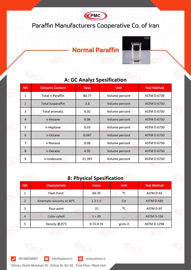 موارد کاربرد: نرمال پارافین ها دارای کاربرد به عنوان حلال (صنایع رنگ و رزین) ، سورفاکتانت( انواع پاک کننده ها) ، ساخت ترکیبات فلزکاری ، نرم کننده ها، کلروپارافین ها، تولید روغن نورد سرد الومینیوم، آلکیل بنزن های خطی، شمع سازی، کبریت سازی و پایه محصولات وازلین می باشد