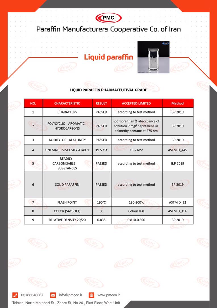 پارافین مایع مخلوطی از هیدروکربن های اشباع شده حلقوی و زنجیره های کربنی کوتاه می باشد که پس از تصفیه کاملا بدون بو و رنگ بوده و به علت خلوص و پایداری بالا در بسیاری از صنایع مورد استفاده قرار می گیرد.
